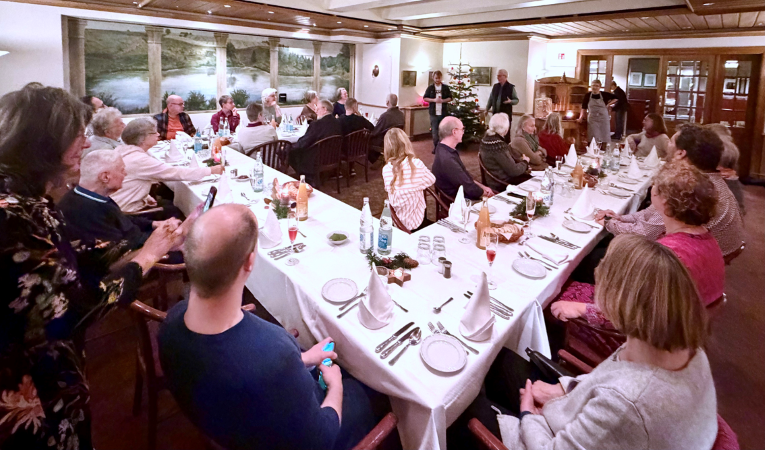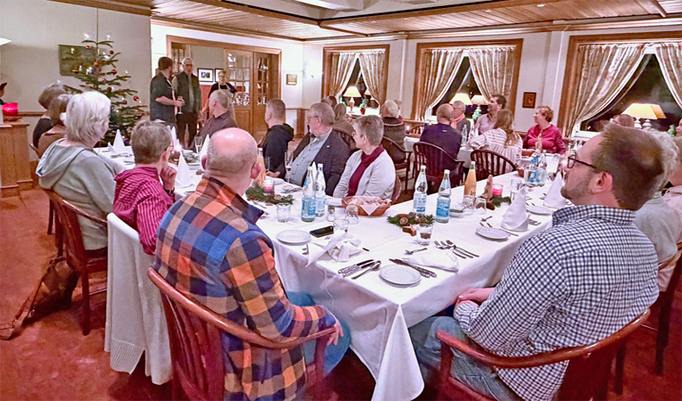Auf Initiative von Angela Schulze-Hamann (OV-Trave-Land) und Mona-Luise Wagemann (OV Bad Segeberg) trafen wir uns zu einer gemeinsamen Weihnachtsfeier im schönen Landhaus Schulze-Hamann in Blunk. Angela hatte mit ihrem Team ein vegetarisch/veganes Buffet vorbereitet, das alle Beteiligten mit Genuss zu sich nahmen. Die Teilnehmer:innen entrichteten für das Menue incl. Apfel-Schorle und Wasser 30 Euro. Beide Ortsverbände boten bei Bedarf einen Zuschuss von 5 Euro an, der aber nicht in Anspruch genommen wurde.